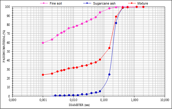 The addition of ash to fine soil remodels the granulometry of the pure material. Thus, through the analysis of the granulometric curves, it can be seen that there was an increase in the sand fractions and a reduction in the clay and silt fraction content.