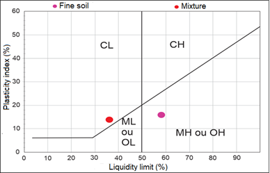 According to the results, it is possible to notice a considerable reduction in the values of the limits of liquidity and plasticity, as well as in the plasticity index, as observed in the literature5,6, which indicates an improvement in the quality of the material resulting from the mixture.