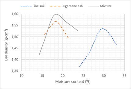 The compaction curves to determine the maximum dry density and optimum moisture were carried out at intermediate energy for fine soil, for ash and for the mixture, and the results are shown in Figure 7.