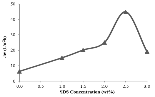 Membrane formulation greatly influenced the performance of RO membrane. Composition of the surfactant in membrane solution will affect the performance of the resultant membrane. The SDS concentration was varies from 1wt% to 3wt%. The pure water permeability of the membranes was investigated using distilled water under 5 bars operating pressure. From the result obtained in Figure 1, at 1wt% of SDS, the fabricated membrane produced the permeability about 15.11L/m2h. By increasing 0.5 wt% of surfactant concentration in the casting solution, the PWP increased and reached the maximum value of about 44.8L/m2h at 2.5wt% of SDS. At 3wt%, PWP showed an inverse trend of permeability with reduction of about 57.4%. Addition of high amount of surfactant concentration leads to higher viscosity of solution which inhibits the penetration of non-solvent and weaken macrovoid formation and therefore, resulting in decreasing of membrane porosity and permeability.18,19