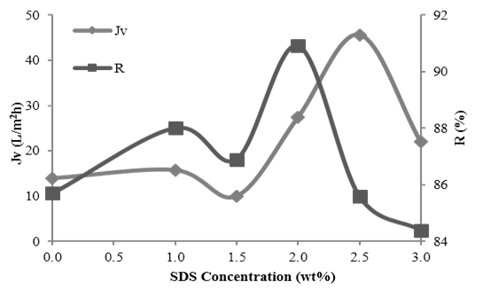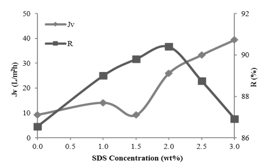 From Figure 2 and Figure 3, 2 wt% is the optimum concentration of SDS for the membranes as it depicted the maximum rejection of salt in brackish and seawater analysis. The optimal performance of the membranes at this point might be due to the increasing of membrane porosity and lower skin layer thickness, thus, resulting in the increment of permeability rate.18