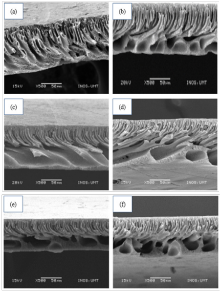 The surface morphology of the polysulfone membranes with different concentration of SDS was shown in Figure 4 (a)-(f). The SEM images indicated that the addition of surfactant causes an increase in the formation of micro and macrovoids, depending on the use of surfactant concentration. In this study, all the fabricated membranes exhibit asymmetric structures with a combination of two layers, which are active layer and supporting layer that have significant role in membrane performance.