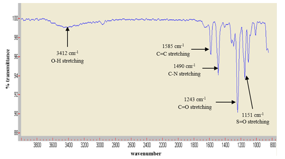 In Figure 5, the spectrum of membrane without surfactant shows the transmittance band observed near 3412 cm-1 which assigned to O-H stretching vibration of PSF polymer. The presence of aromatic C=C, C=O and S=O bonds were belong to PSF polymer and interpreted at 1585cm-1, 1243 cm-1 and 1151 cm-1, respectively. These results were agree with the finding of Mehta and co-author and study by Karimi and co-workers.30,31 In addition, the transmittance band observed at 1490 cm-1 can be explained owing to the C-N bond stretching vibration which proved that the presence of PVP as additive in the membrane. This transmittance band value can be related with the previous study which mentioned that the C-N stretch value is within 1112-1595 cm-1.32 The similarity of infrared spectrum confirmed that PSF membranes display about same activity even after the existence of additive and surfactant.