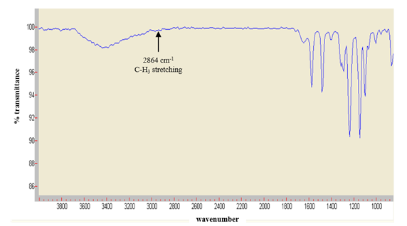 FTIR spectrum for optimal performance membrane at 2 wt% of surfactant was shown in Figure 6. The FTIR spectrum in this figure does not showed significant changes compared to Figure 5 due to similar chemical solutions used as the base materials in membrane making. However, no major peak observed for SDS molecule as displayed. Yet, a C-H3 stretching at 2864 cm-1 confirmed the existence of SDS surfactant. This peak in line with the finding of Viana and co-authors which discover the stretching of C-H3 group from SDS at 2873 cm-1.33
