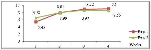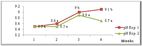 Figure 2 shows a statistically significant difference in experiment 1 between weeks 1 and 2 with respect to weeks 3 and 4, remaining in an alkaline range in all cases, increasing its value as the study time increased. The initial pH of the bed (8.5) does not coincide with what was proposed by Ferrer,11 who stated that the initial pH of digestible materials, garbage, manure, varies generally from 5.5 to 7.0, although in experiment 2 a better pH behavior, because although it slightly increases its value, it does not show significant differences between the weeks of study, remaining at acceptable levels for the control of the release of ammonia into the medium, so if we maintain the pH in ranges of 8.5 it is possible to reduce the emission of ammonia gases and improve the environmental conditions, which influences the accommodation of the poultry and, consequently, improves their productive and health expression.