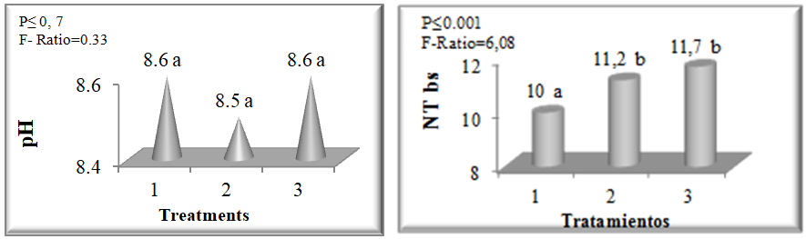 Although there is no statistically significant difference in pH levels, the one observed in treatment 2, is adjusted to the range referred by, Uribe et al.13 that recognizes that the pH between 7.5-8.5 is favorable for microbial activity and that above this it can be critical, due to the emission of ammonia gases. The addition of quick lime to the pits, due to its alkaline state, favors the release of ammonia into the medium, contrary to the expected effect with the application of LEBAME.