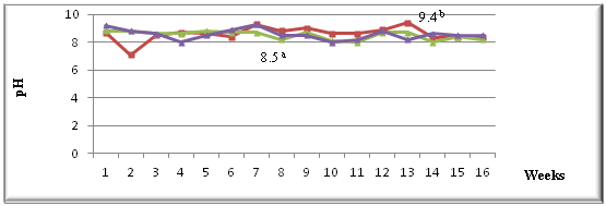 The behavior of the pH does not show a significant difference between the weeks studied for the treatments. The graph shows that the highest levels correspond to the control treatment (9.4), demonstrating the favorable action of LEBAME, which achieves pH stabilization below 8.5 in treatments 2 and 3 from week 8, which for the control treatment was in week 14. This coincides with what was raised by Miyashiro and Meggs,17 when referring to the action of efficient microorganisms in the acceleration of the stabilization of digestible materials and manure, by providing a greater microbial activity.