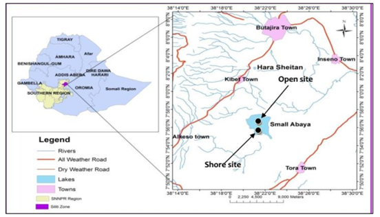 Lake Tinshu Abaya, which is interchangeably called Small Abaya to imply its size and to separate the other large lake (L. Abaya) having similar name of Tinishu Abaya, is located at about 160 km Southwest of Addis Ababa, capital city of Ethiopia. It is situated in the Silttie Zone (Silttie District, Kebet/Silttie Town) of the Southern Nations, Nationalities and Peoples Regional State of Ethiopia. It is found in a small village termed Gebrie–Ber located at about 15 km in the eastern direction from the town of Kebet/Silttie. The lake is located at 7029´03.65´´N latitude and 38003`17.79´´E longitude and at an altitude of 1835 m above sea level. Lake Tinishu Abaya is a small–sized inland freshwater system among the rift valley lakes of Ethiopia. The lake covers a total area of 1253 hectares (12.53 km2).9 It is a shallow lake with a maximum and a mean depth of 3.7 m and 2.9 m respectively (survey of this study). The lake is almost an oval shape (Figure 1). Lake Tinishu Abaya has two feeder rivers and a single outlet. Rivers Dacha (northern corned) and Boboda (southern corner) are the main tributaries for the Lake Tinishu Abaya. River Badober (northern corner) is a small river which served as an outlet for the lake. During this study, two major perennial rivers (Rivers Dacha and Boboda) and a single outlet (River Badober) were always active.