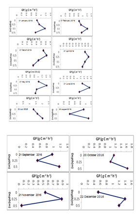 Figure 3 Depth profiles of gross photosynthesis per unit volume (GP, g C m-3 h-1) at open station during the study period (January to December, 2016).