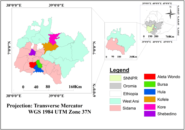 The study areas were selected based on the abundance of Lippia adoensis. Based on the recommendations of zonal agricultural office six potential Lippia adoensis growing districts were selected from Sidama and West Arsi Zones, four districts from Sidama (Bursa, Hula, Aleta Wondo and Shebedino) and two districts from West Arsi (Kofele and Koree) Zones. In addition, two Kebeles were selected from each district bringing the total number of sampled Kebeles to 12 where Lippia adoensis is abundantly found Guchi, Qabete, Shire kobolcha and Meja Yedel were selected from West Arsi. Qenqelcha, Hoba Gangawa, Bursa Qosercha, Chelbesa, Titira, Woto, Termesa and Fura from Sidam Zone were selected to conduct the study.