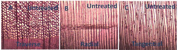 The anatomical properties of the untreated and tin-alloy treated F. simplex are shown in Figures 2–4. Microscopic examinations were performed on the three sections that are, the transverse, radial and tangential sections to observe the changes on the wood anatomy as a result of the influence of tin-alloy modification on the anatomical properties of the wood. The close observation indicated that the wood pores were visible on the images (Figures 2–4) and the colour of the wood became darken after tin-alloy treatment particularly at 210˚C (Figure 4).