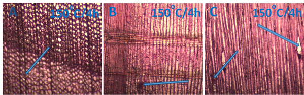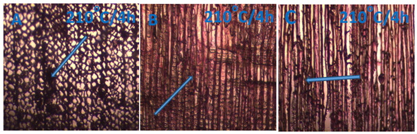 The anatomical structure of the wood appears to be less smashed by the impact of the treatment and there are signs of slight cracks and distortion of the vessels after tin-alloy treatment of F. simplex at 150 and 210oC for 4h compared with the untreated (Figure 3) (Figure 4). Radial and tangential cracks were observed in transverse section, but the shape of the vessels of the tin-bath treated F. simplex wood were not deformed, demonstrating that the anatomical structures of the wood was less affected during tin-bath treatment. Previous research established that the effects of the thermal modification on wood anatomy are strongly linked to the wood species, thus it is difficult to ascertain how cracks develops.5