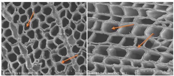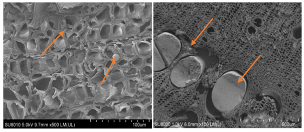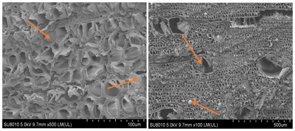 25µm sections of the samples were cut from untreated and tin-alloy treated F. simplex wood. The samples were sliced using a Reichert-Shandon microtome and were mounted on holders with double-sided adhesive tape after coating with a gold sputter. Morphological properties of the samples were examined using a SU8010 Scanning Electron Microscope (Japan) at different magnifications and a voltage of 5kV (Figure 1).