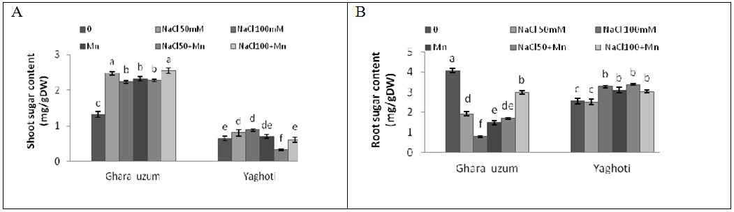 Figure 1 Effects of Mn (1ppm) on soluble sugar content in shoots (A) and roots (B) in two cultivars of grapevine (Yaghoti and Ghara uzum) plants cultivated under saline stress (0, 50 and 100mM NaCl). Each value is the mean (±SE) of four replicates. Different letters on each column show significant difference at p<0.05 by Duncan’s Test.
