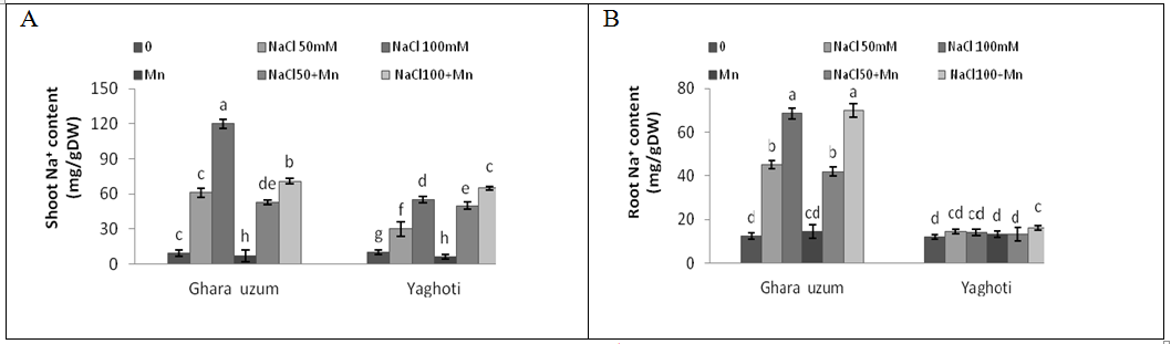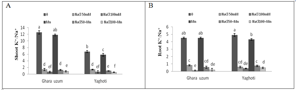 Application of Mn together with saline stress led to an increase in the accumulation of Na+ and Cl- ions in Yaghoti cultivar about 18-66% in shoot Na+, 15.7% in root Na+ (Mn+100mM NaCl), 12-65% in shoot Cl-, 11% in root Cl- (Mn+50mM NaCl), 18-41% in root K+, and 23-29% in root K+/Na+ ratio. Similarly in Ghara uzum cultivar this led to an increase of 2% in root Na+, 106% in root K+ (Mn+100mM NaCl), 23-30% in root Cl-, and 96% in root K+/Na+ ratio (Mn + 100 mM NaCl). In contrast, applying Mn together with salinity in Ghara uzum cultivar led to a decrease in shoot Na+ (14-40%), root Cl- (12-57%), and root K+/Na+ ratio (30% in Mn+50mM NaCl). Similarly in Yaghoti cultivar this led to a decrease in root Na+ (9% in Mn+50mM NaCl), root Cl- (24% in Mn+100mM NaCl), and shoot K+/Na+ ratio (19-31%).