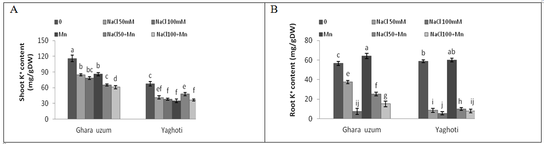 Figure 3 Effects of Mn (1ppm) on concentration of K+ in shoots (A) and roots (B) in two grapevine cultivars (Yaghoti and Ghara uzum) plants cultivated under saline stress (0, 50 and 100 mM NaCl). Each value is the mean (±SE) of four replicates. Different letters on each column show significant difference at p<0.05 by Duncan’s Test.