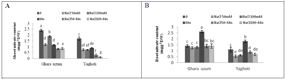 Figure 6 Effect of Mn (1ppm) on nitrate content in shoots (A) and roots (B) in two grapevine cultivars (Yaghoti and Ghara uzum) cultivated under saline stress (0, 50 and 100mM NaCl). Each value is the mean (±SE) of four replicates. Different letters on each column show significant difference at p<0.05 by Duncan’s Test.