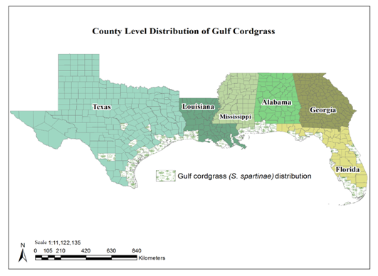 Gulf cordgrass (Spartina spartinae (Trin.) Merr. ex Hitchc.[Trin.] Hitchc.) is a highly productive, C4 warm season perennial bunchgrass able to tolerate a large range of climatic conditions in both hemispheres.1,2 It is found in the United States along the coast of the Gulf of Mexico from Florida to Texas (Figure 1), and south into eastern Mexico. It also can be found, although less commonly, inland in marshes and seasonally–flooded prairies. Additionally, it grows in South America along the Caribbean coasts and inland in Argentina and Paraguay.3 Also known as “sacahuista” (from the Nahuatl, an Uto–Aztecan language indigenous to Central Mexico, “zacahuitztli,” from “zacatl” meaning grass or hay and “huitztli” meaning thorn4), gulf cordgrass grows 1–2 m tall with short peripheral subrhizomes; true rhizomes are absent. Culms are numerous, up to 2 m long and 2.4 mm thick, broad at the base, and closely involute essentially the entire length. It has 10 to 75 spikes per panicle, closely appressed and overlapping, and 16 to 40 spikelets per spike. The lower glume is nearly as long as the spikelet and hispid on keels.5,6 Gulf cordgrass thrives in various soils that are typically above sea level, but occasionally submerged.7 It has been reported to occur in soils ranging from sandy loams to clays and heavy clays with its greatest standing crop yield in fertile clay loams and clays because of higher moisture–holding capabilities in these soil textures.8,9 Oefinger and Scifres10 reported that cordgrass occurs on soils relatively high in sodium on the coastal prairie, and that its dominance in areas of high salinity may be attributable to the fact that other halophytes are unable to successfully compete with it. In southern Texas, the greatest herbage yield for gulf cordgrass occurs during rainy spring months and during September and October when tropical storms bring additional moisture.11 Gulf cordgrass can maintain green tissue year–round in coastal prairies, 1,8,12 making it an important range forage species in the Coastal Prairies and Marshes ecoregion of Texas since the beginning of cattle raising there in the mid–1880s.13 However, although gulf cordgrass can maintain green tissue year–round, mature plants are not grazed to an appreciable extent by livestock if other forages are available. Mature growth produces coarse, stiff, and spine–like leaf blades with low palatability and nutritional quality, making it less valuable for livestock and wildlife.8,12,14