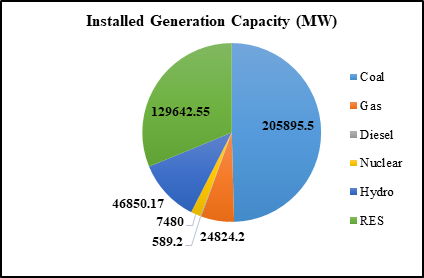 The global demand for cooling and air conditioning systems is increasing as a result of modernization and population growth. In the past, the requirements for cooling and air conditioning were met using traditional methods. On the contrary, traditional cooling methods that are highly dependent on electricity usage contribute to elevated energy requirements and the subsequent release of greenhouse gas emissions. Globally, these cooling systems consume approximately 15% of all electricity generated, as reported by the International Institute of Refrigeration.1 It is anticipated that there will be an increase in conjunction with the projected global summer temperature rise of 2-4℃ by the end of this century.2 To address these challenges, there is a growing interest in sustainable and energy-efficient cooling systems. One such technology that holds promise is the absorption cooling system, which utilizes waste heat, solar energy etc., to provide cooling. India is a vast country with enormous and increasing electricity demand. In this scenario, the cooling system electricity demand creates an additional burden which can often be fulfilled by the waste heat utilization through the absorption cooling system (ACS). In ACS water serves as the absorbent and ammonia as the refrigerant. The main components of the ACS include the evaporator, absorber, condenser, and generator, with auxiliary elements such as the separator, throttle valves, HE, and pump. The system utilized the waste heat at the generator to heat the rich ammonia solution, causing ammonia to evaporate and leaving behind a hot weak solution. The ammonia vapor produced by the generator undergoes condensation within the condenser, forming high-pressure liquid ammonia. Subsequently, the condensed ammonia undergoes pressure reduction by passing through the throttle valve, leading to its evaporation within the evaporator, resulting in the generation of the cooling effect. Following this, it proceeds to the absorber, combining to form a concentrated solution with ammonia. This concentrated solution is then pumped back into the generator. Meanwhile, the generator's remaining weak hot ammonia solution passes through the solution heat exchanger (SHE) and throttle valve and returns to the absorber at low pressure. The system requires a separator to separate the pure ammonia from the solution before sending it into the condenser. For improved cycle performance, a SHE as shown in Figure 1, is typically incorporated into the system, which preheats the weak solution before entering the generator; this requires less external heat input to drive the absorption process. Notably, the pump is the only component that necessitates work input in the ACS. Nevertheless, the amount of work required is considerably insignificant in comparison to the compressor of the vapor compression system. The total installed energy generation capacity by each sector from different resources in India as of June 2023, according to the central electricity authority (CEA), was 421901.63 MW, shown in Figure 2.3 The primary source of energy generation in India is coal, where coal-based power plants dominate 48.8% of the total installed capacity. In power plants, a massive amount of waste heat is present at very low temperatures, such as condenser, flue gas exhaust etc. This heat is difficult to convert efficiently into useful work from the conventional method, and because of that, it is mostly released into the atmosphere.4 Many have proposed modifying the thermodynamic cycles in recent years to take advantage of waste heat.5–8 The efficient utilization of waste heat from industrial processes has gained significant attention as a means to reduce energy consumption and minimize environmental impact, so the integration of the ammonia-water-based absorption cooling system with flue gas waste heat presents numerous advantages. Firstly, it enables the utilization of waste heat, enhancing the overall energy efficiency of the power plant. By tapping into this waste heat stream, the cooling system significantly reduces the environmental impact associated with coal-based power generation. Moreover, as the system operates without relying on electricity, it reduces the demand for additional energy sources, leading to a decrease in greenhouse gas emissions. Additionally, the ACS does not harm the ozone layer, making it environmentally safe. Extensive literature is available on the performance characteristics and thermodynamic analysis of ACS. Chen and Schouten focused on optimizing the irreversible ACS performance, using an irreversibility factor to enhance the Coefficient of Performance (COP) by tuning various system parameters.9 Chua et al. created a model for an irreversible ammonia-water absorption chiller that takes internal entropy production and heat exchanger thermal conductance into account. When this model was applied to a single-stage chiller, it was discovered that the rectifier had the greatest heat dissipation.10 Sun compared the performance of different working fluid pair- based absorption refrigeration systems (ARS).11 Keçeciler et al. conducted an experiment on the thermodynamic analysis of an ARS using geothermal energy as the power source and got a cooling effect of 225.57 kW.12 Shankar et al. coupled the Kalina cycle and ARS for combined cooling and power a got a power output of 22.5kW with a cooling capacity of 200kW.13 From the literature, it can be concluded that the ACS emerges as the most commonly used system, capable of harnessing various heat sources, including waste heat, geothermal energy, ocean thermal energy, and solar energy. However, there is a dearth of literature on utilizing power plant waste heat to drive the ACS. In addition, there is a limited discussion on the thermodynamic performance of the ACS.