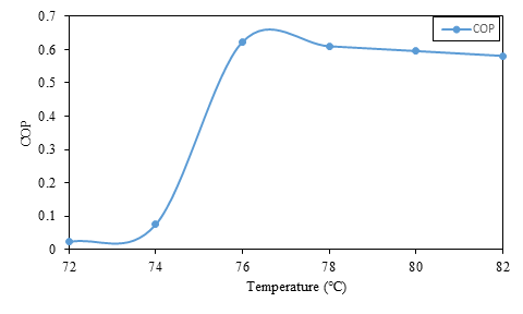 Figure 5 depicts the impact of the generator temperature on COP of ACS. The COP reach their peak values between 74- 78 ℃, beyond which the curve flattens and begins to exhibit a declining pattern. This behaviour is attributed to more ammonia vapor forming at higher generator temperatures; this, in turn, leads to a rise in the absorber solution temperature within both the absorber and generator units, resulting in a greater amount of exergy losses occurring in these components.