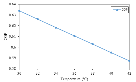 Figure 6 depicts the impact of condenser temperature on COP of ACS. And it shows that with increasing condenser temperature, the COP of the system decrease. For the constant cooling capacity of 105 kW, increasing condenser temperature leads to high thermal load in the generator, causing less ammonia vapour formation from the generator. Because of that, the COP of the system decrease. Hence, lowering the condenser temperature increases the temperature difference between the condenser and the ambient environment, allowing for more efficient heat rejection and enhancing the system's cooling capacity.