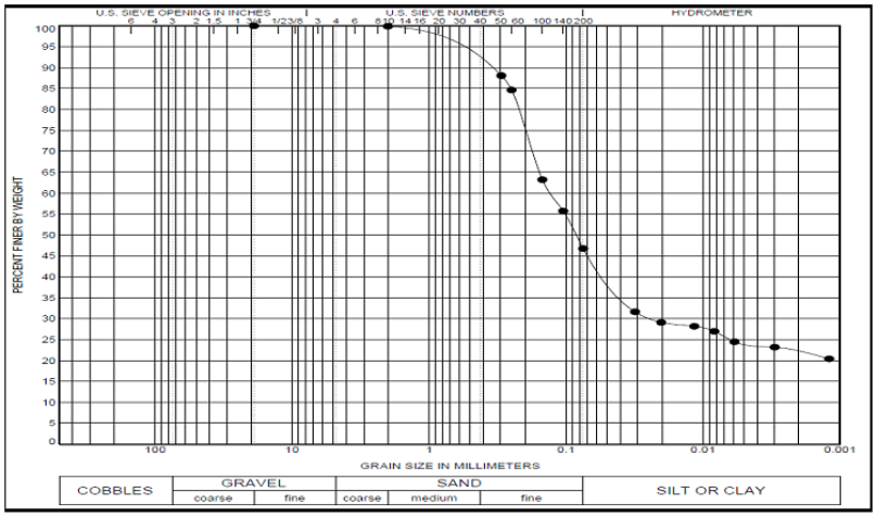 pH of soil, soil-SSA mixtures, and SSA were measured using HACH pH meter with the appropriate probe. Two methods were used to experimentally determine specific gravity of soil and the mixtures. One is performed by water pycnometer (ASTM D854) and the other by the gas pycnometer technique (ASTM D5550). Mechanical sieving was used for the coarse-grained portion materials and Hydrometer Analysis used for the fine-grained portion of the materials for grain size distribution, in accordance with ASTM D2487-06, ASTM D422, D1140 and AASHTO T88 and ASTM D7928-17. The grain size distribution curve for the soil used in this study is presented in Figure 1.