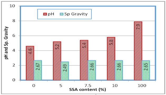The test data were analyzed, plotted, and explained to determine the engineering properties of the soil-SSA mixtures that could be used in a wide range of engineering applications. The soil was acidic when compared with the SSA, as shown in Figure 2. This phenomenon can be attributed to a saturation of calcium ions, impacting both the pH value and the soil treatment mechanism. Calcium ions gradually decrease in concentration as the hydration reaction in treated soil begins. In the beginning, SSA with amounts of calcium mixed with untreated soil leads to high pH values for treated soil. As the hydration reaction begins, the calcium ions are slowly depleted, and thus the calcium ion saturation in the treated soil is reduced. The soil treated with SSA (mixtures) were less acidic that would be less corrosive to structures and other engineering constructions if the mixtures are used in structural fill. As seen in Figure 2, the specific gravity of the soil, the SSA, and the soil-SSA mixtures varied from 2.49 to 2.67 with a value of 2.65 for SSA which is within the range reported in several studies.10,20 The specific gravity of the soil slightly decreased as the percentage of SSA content in the mixture increased because the specific gravity of the SSA was slightly lower than the specific gravity of the original soil.