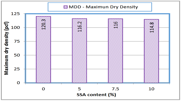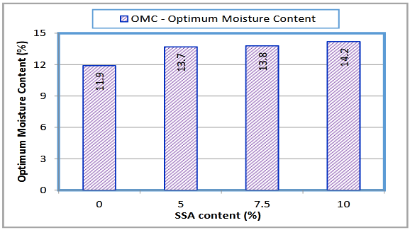 The variations of optimum moisture content (OMC), maximum dry density (MDD) with SSA content within the soil are presented in Figure 3 and Figure 4. As seen from Figure 3 and Figure 4, the OMC varied from 11.9% to 14.2% and the MDD varied from 114.8 to 120.3 pcf. The original soil had the lowest OMC compared to that of the soil-SSA mixtures. OMC had a positive correlation with SSA content. Whereas the original soil had the highest MDD compared to that of the soil-SSA mixtures and it had a negative correlation with SSA content. This could be due to the fact that higher SSA contents required more OMC (Figure 3), moisture contents in the mixtures increased the test sample volume, and hence provided the lower MDD. These test results did not provide any reason or validation to select an optimum SSA content from a compactability/workability point of view. These findings followed similar patterns provided in couple of studies.8,24