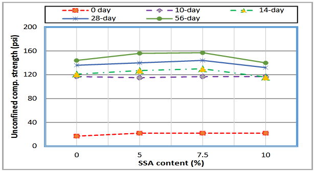 The variations of unconfined compressive strengths (UCS) with SSA content for different curing periods are shown in Figure 6. It is seen in this Figure that soil and all mixtures gained significant strength (about 100psi) in 10 days. Whereas, after 10days, the gain is not that significant (between 20–40psi). UCS showed a peak for 7.5% SSA content for curing periods of 14, 28 and 56 days. The rest showed almost flat for all SSA contents. No strength was gained right after mixing and started gaining strength with time. UCS appeared to decrease after 7.5% content for three curing periods (14-, 28-, and 56-day) that is consistent with a study conducted by Lynn et al.13 However, several other studies reviewed by Lynn et al.13 provided contradictory results. According to a few studies,9,25 the contents of SiO2 (17.27-50.60%) and Al2O3 (6.32–19.09%) in SSA indicated that SSA may be pozzolanic with the potential to be used as supplementary cementitious material (SCM). There are numerous direct and indirect methods for determining the pozzolanic activity of a material.25 To date, most research has used indirect methods, i.e. recording the effects of substituting part of the cement content by SSA on mortars and pastes on compressive strength. Adverse effects are attributed to increased water requirements due to the irregular morphology of SSA particles.26 Using direct methods, Jamshidi et al.27 determined the pozzolanic activity of SSA to be 37.86%, while Fontes et al.28 derived a value of 70.53%. Therefore, pozzolanic materials in SSA may attribute to the increase in UCS of the treated soils by SSA. Since a curing period of 28 days seemed to be an optimum (Figure 5), 7.5% SSA content appeared to be the optimum soil-SSA mixture to provide maximum strength. However, based on the data for curing periods of 28 and 56 days, the 5% SSA content could be a viable alternative.
