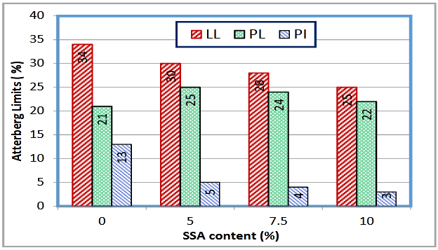 The variations of Atterberg Limits (LL, PL, and PI) with SSA content are presented in Figure 7. As seen in this Figure, the LL of the original soil was the highest, followed by the mixture with 5% SSA, the mixture with 7.5% SSA, and the mixture with 10% SSA. The PL for the mixture with 5% was the highest, followed by the mixture with 7.5% SSA, the mixture with 10% SSA, and the original soil. The decrease of the PL could be attributed to the multivalent cations (Ca2+, Fe3+, and Al3+) provided by the SSA work on displacing monovalent cations (Mg2+>Ca2+>Na+>K+), the abundance of multivalent cations changes the soil particles’ electrical charge which causes the soil particles attracted to each other. The electrical attraction of soil particles aids the flocculation and is attributed to the change in soil nature (granular nature after flocculation and agglomeration) and resulted in reduced soil plasticity. The original soil showed the highest PI (13%), followed by the mixture with 5% SSA (5%), the mixture with 7.5% SSA (4%), and the mixture with 10% SSA (3%), which is consistent with a similar study conducted by Luo et al.16