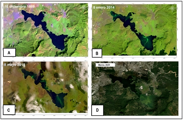 It can be seen that from 2014 in the southeast and northwest part of the lake an accumulation of organic matter began, contributing to the development of algae, by 2018, four years later, the accumulation of algae was more visible on the shores and northeast part. , finally by the year 2021, in the southeast part the accumulation of algae is notorious, covering more than 30% of the total lake.
