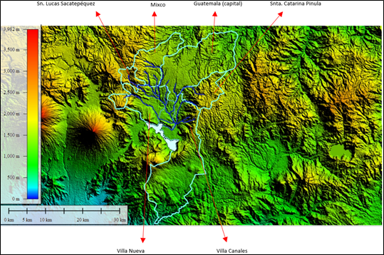 Lake Amatitlán has only one tributary: the Villalobos River. This in turn has several tributaries that come from San Lucas and México (to the Northwest) and from Puerta Parada and Carretera to El Salvador (East) (Figure 2).