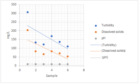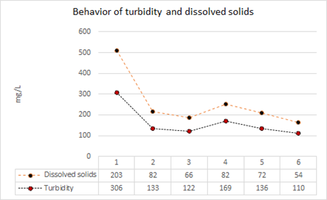 As can be seen, for solids in suspension as for turbidity the tendency is to decrease, these parameters are closely related, the correlation coefficient for turbidity is -0.9868611, and for solids in suspension it is -0.9868611. The pH has an insignificant tendency to decrease, in the parameter comparison table it was reduced until reaching an acceptable value according to the reference, the correlation coefficient of this is -0.6119881.
