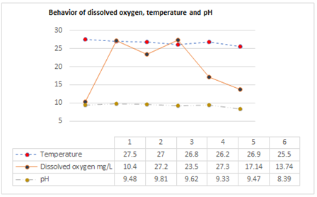 In relation to the dissolved oxygen, it started with 10.4mg/L with a maximum peak of 27.3 g/L, with respect to the samples where it decreases, it is because a large amount of oxygen was applied, having a large amount both in percentage and in mg/L of this bacterium takes advantage of the availability of oxygen to feed and then degrade itself. This process can be observed in the decreasing peaks. Finally, in the last two samples there is a decomposition, this is the optimal point of application of the nanobubble, that is, if more oxygen is applied, the bacteria that help the decomposition process, on the other hand, the relationship with the temperature, at the moment that there is an increase in temperature, the oxygen decays, this principle is due to volatilization.