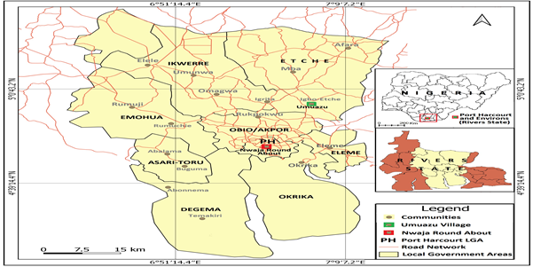 The study areas were Nwaja Roundabout, Trans Amadi Industrial Layout, Port Harcourt Local Government Area (urban) and Umuazu village, Igbo-Etche, Etche Local Government Area (rural) in Rivers State, Nigeria as shown in Figure 1 below.