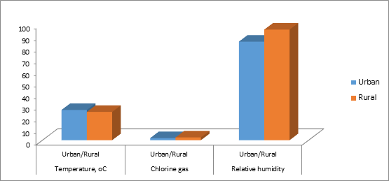 The results of the chlorine gas gave mean concentrations ranging from 1.85±0.21-2.39±0.48 as shown in Table 5, Table 6 and Figure 4 above. Comparing the obtained values with the air quality index (AQI) rating, chlorine gas values were rated Poor (D) in the urban area and Very Poor (E) in the rural areas which was a result of the industrial activities of both areas of the state. The results obtained for chlorine gas in this study in the urban and rural areas were in agreement with the earlier findings by Nicholas and Ukoha who gave higher values of chlorine gas (1.00±0.09-2.68±0.63) in Douglas Road, Market area (Taxis loading Bay), Owerri Municipal Council (urban) and in Ezihe village (village square area), Uzii, Ideato North Local Government Area (rural), Imo State, Nigeria.1