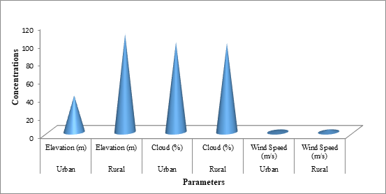 The values obtained for cloud cover (%) gave mean concentrations ranging from 98.33±1.15-98.33±2.87 % as shown in Table 5, Table 6 and Figure 4 above. The results obtained for cloud cover in this study in both areas of the state were in agreement with the earlier findings by Nicholas and Ukoha who gave cloud cover values of 85.33±10.50-87.33±15.04 % in Warri and Okpanam, Delta State, Nigeria.3