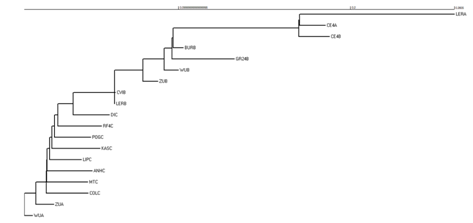 ree Rpp8_exon_Inferred_Tree = ((((((((((((((((((((LERA:0.09000136624542679,CE4A:0.01503756983610329):0.000316165340808537,CE4B:0.01761276106787022):0.07334003045518941,BURB:0.00593938209990952):0.0005317053089915296,GR24B:0.03620311007347032):0.004668614044940492,WUB:0.008326044437385582):0.01239875306602262,ZUB:0.008793496401449212):0.01641548843393813,CVIB:0.0003676698446704323):0,LERB:0):0.02416450711484472,DIC:0.02111022109495939):0.008755805479867542,RF4C:0.02543199977040228):0.002005481802426233,POGC:0.02104453750789026):0.001505794741206088,KASC:0.02789363176748686):0.001389507151479656,LIPC:0.01857230438809743):0.001511738897326903,ANHC:0.02629285109028 ):5.742718077386632e-005,MTC:0.02371879148005516):0.0003265496464542152,COLC:0.02426326077083362):0.005977313377074652,ZUA:0.01037715260436323):0.006719285060534071,WUA:0.004599264671472049):0.004821488309967518,GR24A:0.02194269960138536):0.005586829289623845,BURA:0.01648827355939167,CVIA:0.01759480053849204); |