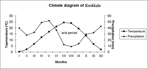 Kırıkkale has a population of 280.834 individuals and is located in Central Anatolia (according to the 2000 census) (Figure 1) (Figure 2).43 Among the important industries in the city are the arms industry, steel industry, oil refinery, production of electrical machinery, brick-tile production and flour production. As a result of the activities of these facilities, the concentration of SO2, H2S, NO, NO2, CO, heavy metals, CO2 and particulate matter in Kırıkkale city atmosphere increases. Highways and heating activities at homes are among the primary causes of contaminations in the air of Kırıkkale. Because the wettest months of the year are spring and early summer, Kırıkkale has an arid summer regional climate with humid regional climate traits. Depending on location and height, the province exhibits all four of these regional climate subtypes. The city is situated in the province's transitional area. Summers are typically hot and dry, while winters are typically frigid and snowy.44 The climate diagram of Kırıkkale was given in Figure 3. The predominant winds are from NNW, NW, SSW (Figure 4).45 As monitoring locations, 12 exposure locations in the city of Kırıkkale were chosen (Table 1). The samples taken from the forest area of Yapraklı-Çankırı were generally hung in the places with high traffic in the city (1,2,3,4,5,6,7,8,9,10 and 12 stations), only the 11th station is near the steel industry (ÇELBOR steel industry). And since the period of exposure to pollution coincides with autumn and winter months, urban domestic heating activities are intense in the areas where the stations are located.