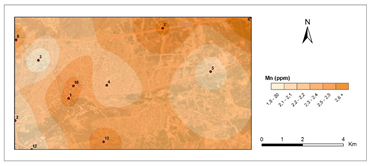 The highest levels of Mn were found in 4th station in 2nd period 3,06 μg g−1 and lowest at 3rd station in 1st period (1,83 μg g−1). The average Mn concentration found in this study was 2.38 μg g-1. The average Mn concentration found is lower than the Ni concentration obtained in the studies.49,54,55 The air pollution maps for Mn show a rise in the accumulation of Mn for station 4 (Highway) in the second period was also easily predicted. Vehicle pollution resulted in significant bioaccumulation.