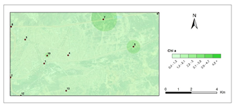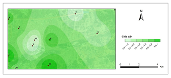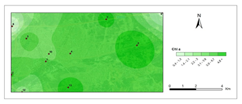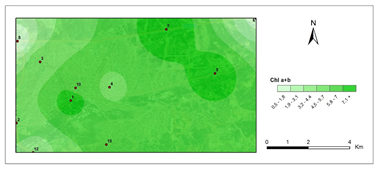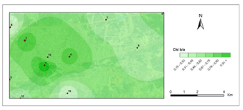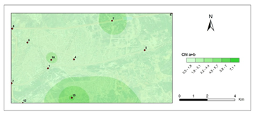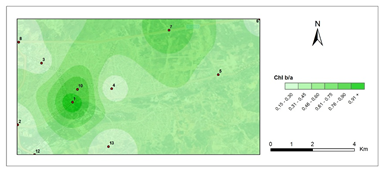 The amounts of photosynthetic pigments are readily calculated and are commonly used to monitor metal stress on plants and lichens. Heavy metals are said to inhibit enzymes that regulate chlorophyll biosynthesis and to prevent the production of chlorophyll pigments. Woolhouse65 demonstrated that Zn reduced photosynthetic pigments by replacing itself with Fe, which is needed for chlorophyll biosynthesis.65 According to Lu et al.,66 Cu concentration has reduced chlorophyll content.66 Heavy metal build up in plant cells causes chlorophyll breakdown. When the heavy metal accumulation images and the chlorophyll concentration maps were contrasted, a clear reverse correlation was noted. The following stations were found to have the highest overall heavy metal accumulation: 1st, 4th, 8th, 7th, 9th, 10th. This finding could also be double-checked with the chlorophyll a+b degradation map, which showed that the photosynthetic pigments had completely degraded. Maps for chlorophyll a/b showed that chlorophyll a was more affected by air pollution than chlorophyll b, pollution weakened photosynthetic pigments, as predicted. The maps for chlorophyll b/a also supported this finding. Environmental stress, such as pollution, could account for all of these variations in chlorophyll a and b amount and ratios. The quantity of chlorophyll in lichen thalli is frequently linked to environmental stress, under stressed circumstances, with more chlorophyll than under non-stressful conditions.67