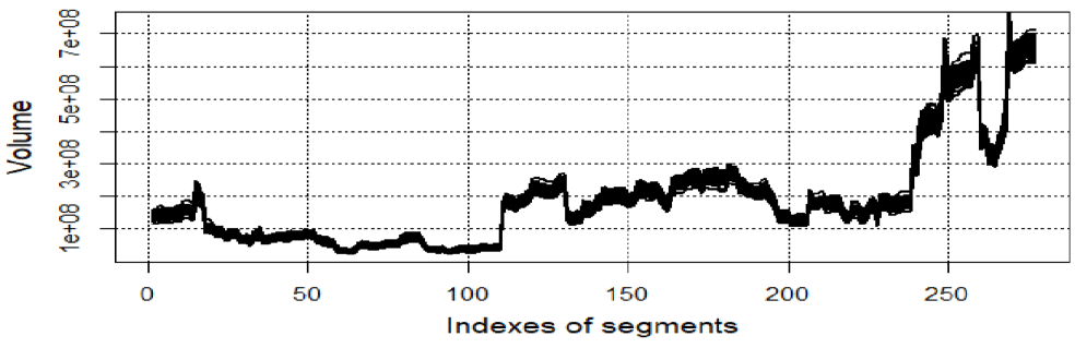 Where Nrec is the number of records in each individual segment, p is index of the segment, segmShift is the time shift between two neighboring segments. To get most stable results, parameter is selected to be much larger compared to segmShift, so that neighbor segments strongly overlap. Results presented in this paper are obtained using parameters segmShift and Nrec defined by Eq. 4.