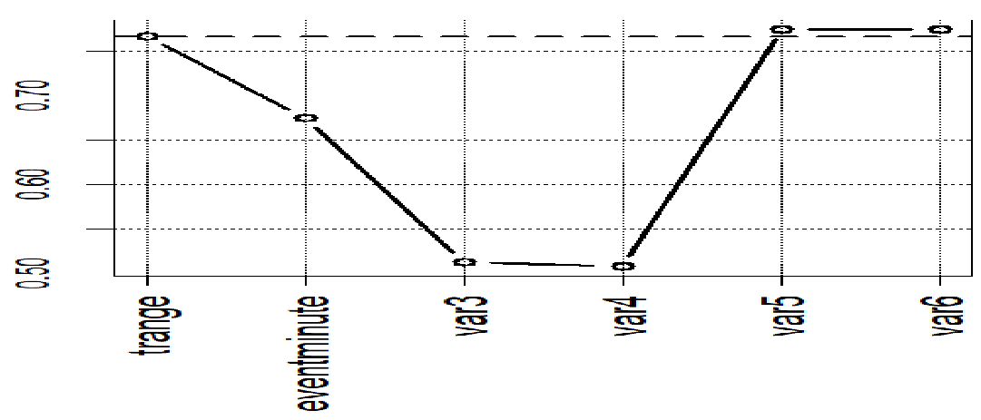 Figure 7 illustrate domination of absolute values of correlation coefficients cor(SRV, Predictor) calculated using predictors var5 and var6. Horizontal discreet line is drawn at the value of correlation coefficient that characterizes variable trange. One can observe that values of correlation coefficients that characterize predictors eventminute, var3, and var4 are3 are below discreet line, whereas correlation coefficients of variables var5 and var6 are3 above this line.