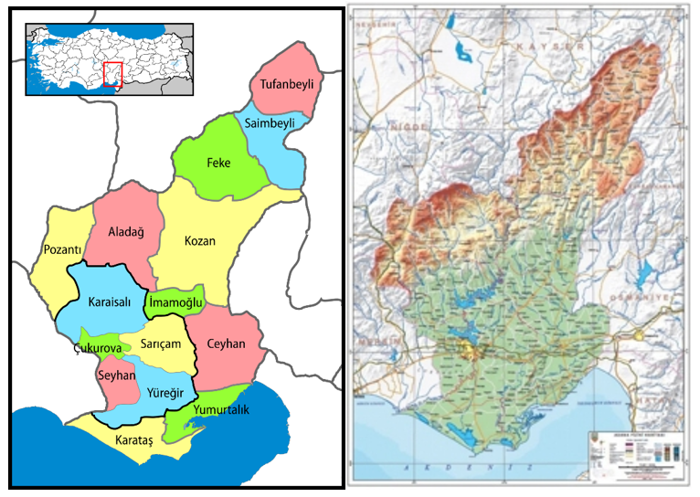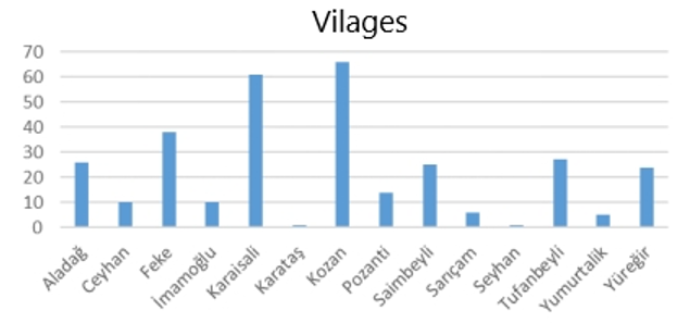 Adana province has regions that can be defined as mountainous, lowland and transitional regions. Transhumance is common in the region; therefore, summer and winter populations in villages vary. Interviews with reeve revealed that the summer and winter populations of villages vary greatly. Looking at the seasonal change in village populations, it is understood that in 85% of the villages, summer populations are higher than winter populations. The livestock structure of Adana province also varies according to the geographical and climatic conditions of the region. Looking at Adana province in general, goat has realized the highest development with an increase of 181% in the last 5 years. There was a 51% increase in sheep (local). The number of sheep (merino) declined by 36% in the last 5 years. There are 467 villages in Adana province, 314 of which fall under the definition of forest villages.3 The surveys were conducted in Kozan and Feke villages, which have the highest number of forest villages. The number of villages according to Adana districts is summarized in Table 1 (Figure 1) (Figure 2).