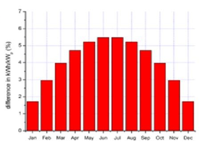 Figure 4 Normalized difference of the bifacial and monofacial kWh/Wp as a function of the time of the day (total energy production in kWh over the entire year.27