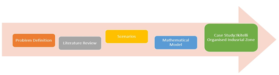 For this study, initially, the problem was determined and then the literature review was completed. An appropriate project was created by taking advantage of previous studies. Scenarios were created to render the project adaptable to different situations. The mathematical model was completed according to these scenarios and a case study was applied using the electricity consumption data of İkitelli Organized Industrial Zone for 2018. These steps are shown in Figure 7 and more information will be given in section 5.