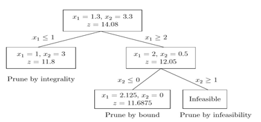 Here, x2 is not required to be an integer. There are two algorithmic principles that have proved successful in solving programs with integers: the branch-and-bound method and the cutting- plane method. Both are based on simple principles, but they are at the core of state-of -the-art programming technology and some mathematical sophistication is required for them to succeed.42 The branch-and-bound method uses a "divide-and-conquer" approach to the idea of partial enumeration. The basic idea is to divide a bigger problem into a series of smaller issues and to solve those smaller issues in order to obtain information about the original problem. Typically, this is expressed through a tree of enumeration.43 The model solution is simplified and is handled primarily by ignoring the condition of being an integer. The linear programming obtained by omitting the integer of all the variables or 0–1 constraints is called integer linear programming (LP) relaxation. The principle of the LP relaxation of an integer-programming problem plays a key role in the integrated programming solution.42