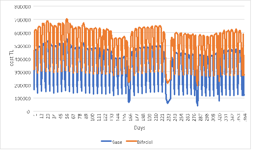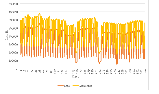 It can be concluded that the monofacial PV system (Figure 15) and the bifacial PV system (Figure 16) are not profitable since the daily base costs are cheaper. In Figure 17, the night tariff is seen as more profitable than the base tariff.49