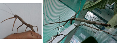 Figure 2 Specimens of Cladomorphus phyllinus Gray, 1835, bred at the Nico Nieser Animal Facility at the Federal University of Triângulo Mineiro, in Uberaba/Minas Gerais. A female on the right and, on the left, two males and a female.