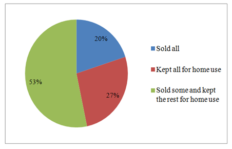 According to Table 4, the sampled respondents in the study area practice two types of preservation methods which are wet salting and air drying. The majority of the respondents (73.3) practice wet salting method to preserve hide and skin. However, only 26.7% of the respondents practice dry salting. Similarly, Ahmed6 stated that hide and skin ready for the market should be preserved either by air drying or wet salting in areas where the tanner is close to the source the raw material. This finding disagrees the finding of7 who indicated that about 94.01% of the respondents used the preservation methods of ground air dry while about 6.25% use salt preservation for hiding and skin preservation. As it is indicated in Figure 2, the higher proportion (53.3%) of the respondents sold some and kept the preserved hide and skin for home use whereas, 26.7 and 20% of the respondents kept for home use and sold all respectively. In this regard, the respondents use to hide and skin for different purposes like preparing bedding materials.